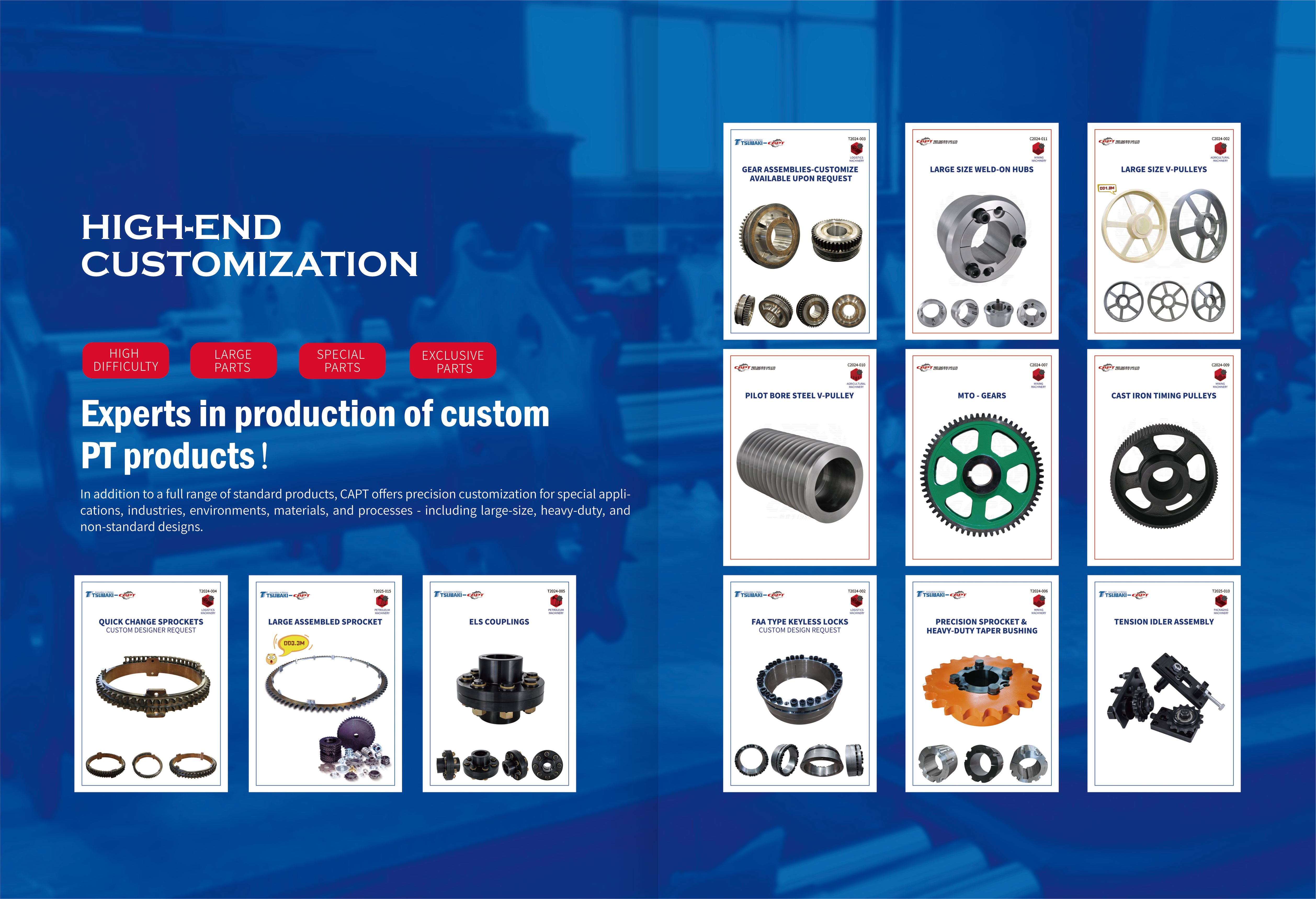 In addition to various standard products, CAPT provides customers with precision customized service, suitable for special purposes, special industries, special environments, special materials and special processes with products characterized by large dimensions,high tonnage,unconventional shapes,etc.